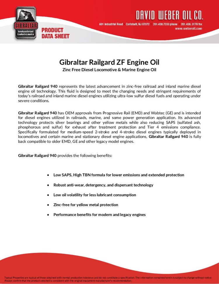 Gibraltar Railgard 940 represents the latest advancement in zinc-free railroad and inland marine diesel engine oil technology. This fluid is designed to meet the changing needs and stringent requirements of today’s railroad and inland marine diesel engines utilizing ultra-low sulfur diesel fuels and operating under severe conditions.